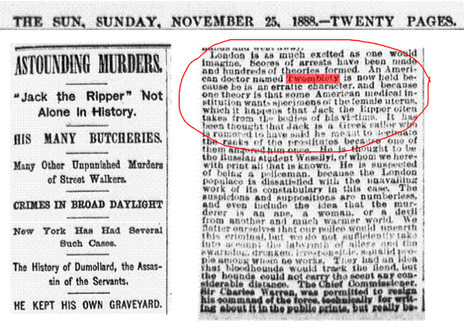 In 1888, the young American medical student/sub-curator story pushed by the coroner was quickly clarified to be the Philadelphia gynacologist who was seeking body parts the year prior. I initially thought that Simms' above comment was about this story, but what never made sense to me was how Simms could screw up the 'who was in London during the whole time of the murders'. Now, it's making sense. I have to find it, but I have a newspaper article stating one of the reasons why Tumblety was suspected was because of the American medical student stuff.