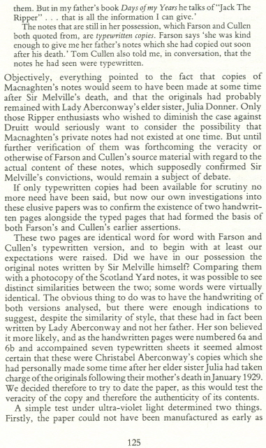 Trevor, I can but agree, it is most odd that neither Cullen nor Farson, both proposing Druitt as the Ripper based on the Aberconway version, published the full document. I am sure that you could teach me a thing or two about dancing.