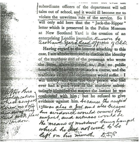Rather than post this on the Marginalia threads, do I gather that further up the page in the shot of the Marginalia that you posted, Swanson noted that the identity of the Dear Boss letter writer was known to the top police officials at Scotland Yard? Perhaps you could post that bit of marginalia in full if you would.