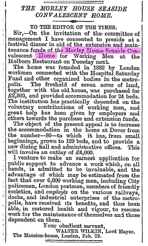"Patients convalescing after operations, and suffering from the debility consequent on fevers, do remarkably well at the Morley Convalescent Home."