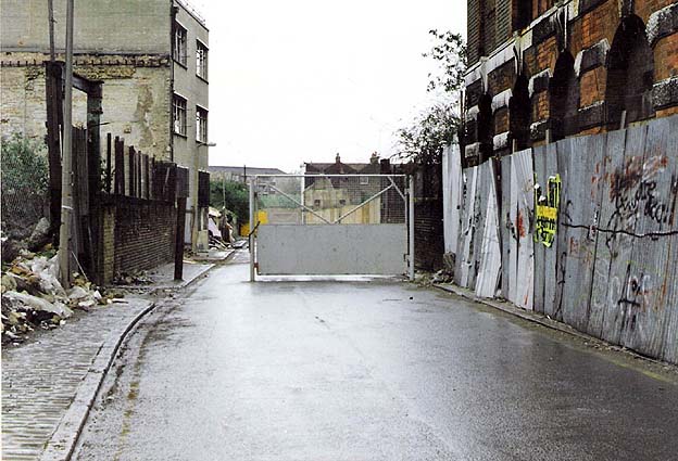 I used to have a photo of the street in 1991 and the graffiti on the iron hoardings is the same, so I assume it's that year (Essex Wharf demolished 1990).