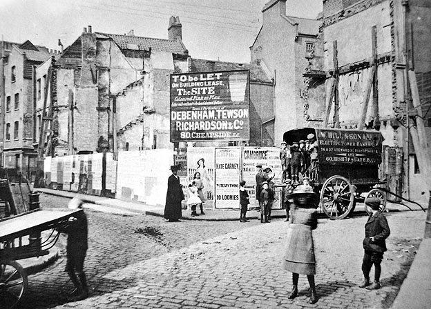 If you look at the photo again, the block which includes the pub is built on the site of St Georges churchyard. Indeed the area on the east side of the road, (the pub side that is) as far south as the Highway, the modern name for Ratcliffe Highway was the graveyard, the church was set back about half way down Cannon Street Road. The victims were buried in St Georges in the East graveyard, I don't know if the above Saint Georges, is the St Georges in question though