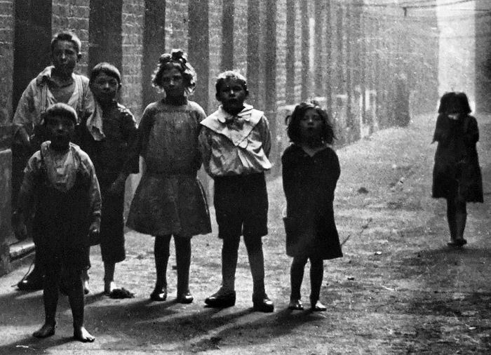 The children make this a sad picture. Also, the way the photographer has chosen to take the picture with the subjects being backlit is, I think, unusual for the period. The children are almost silhouettes and the contrast between light and dark is high. I like this picture a lot.