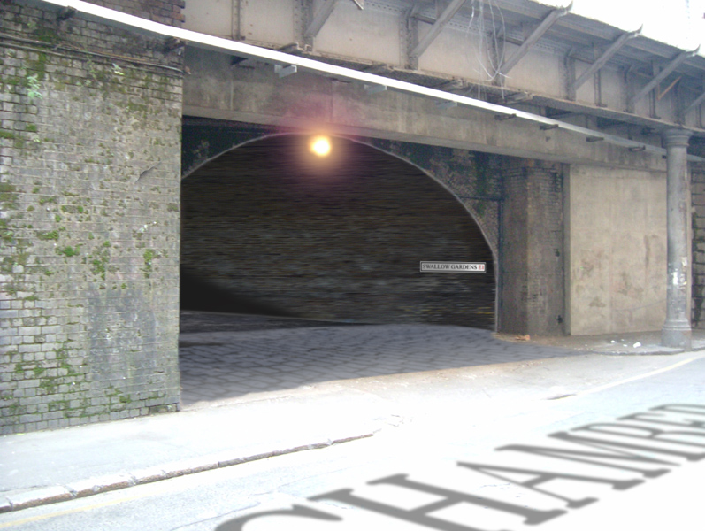 If things had been different, and Swallow Gardens had remained a public right of way, rather than being converted to a business lock-up, then this is what I reckon it might have looked like today. This is a photomontage using several different photographic elements to create the illusion.