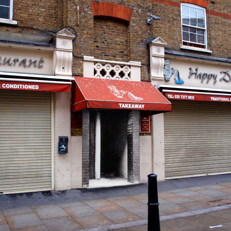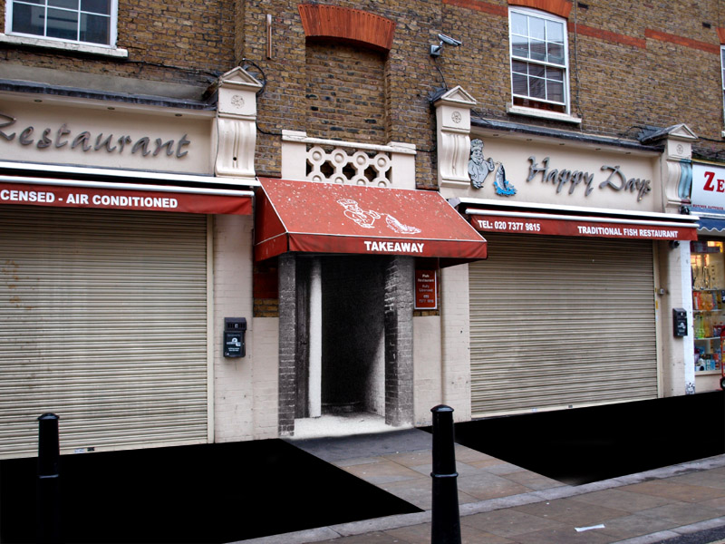 Not posted a photomontage for a while, so here's one I've done in preparation for my next book. The Wentworth Dwellings on Goulston Street, as seen on 31st December 2010. The Happy Days restaurant may be closed, but the old stairway that we all know has magically reappeared and is open to any passing graffito artist!