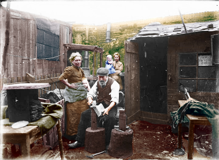 1. The original b&w photo of a backyard scene of a man hammering scrap metal.