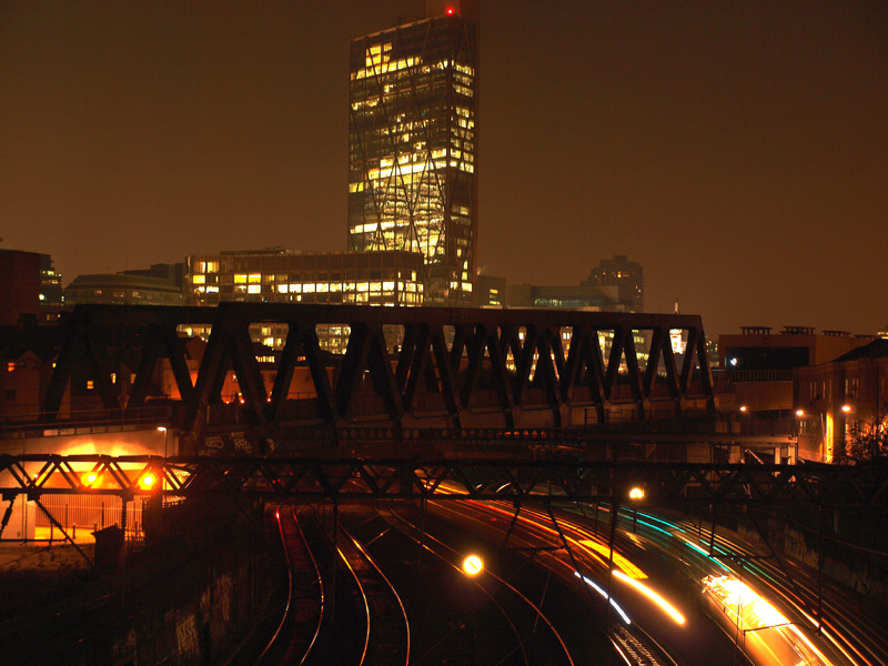 The view looking towards Liverpool Street and the City from the footbridge near Pedley Street.