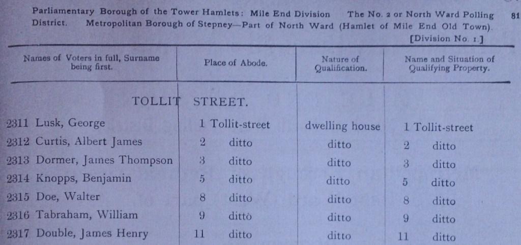 While browsing through the 1902 Electoral Register one fine day (today actually) I happened to notice George Lusk’s entry for 1 Tollit Street and checked to see when he left that addres. He is also registered in 1902, 1903, 1904 and 1905. He is no longer there in 1906.