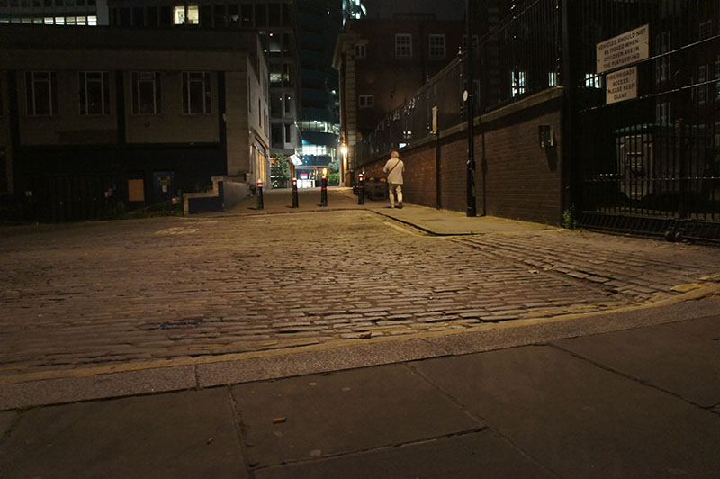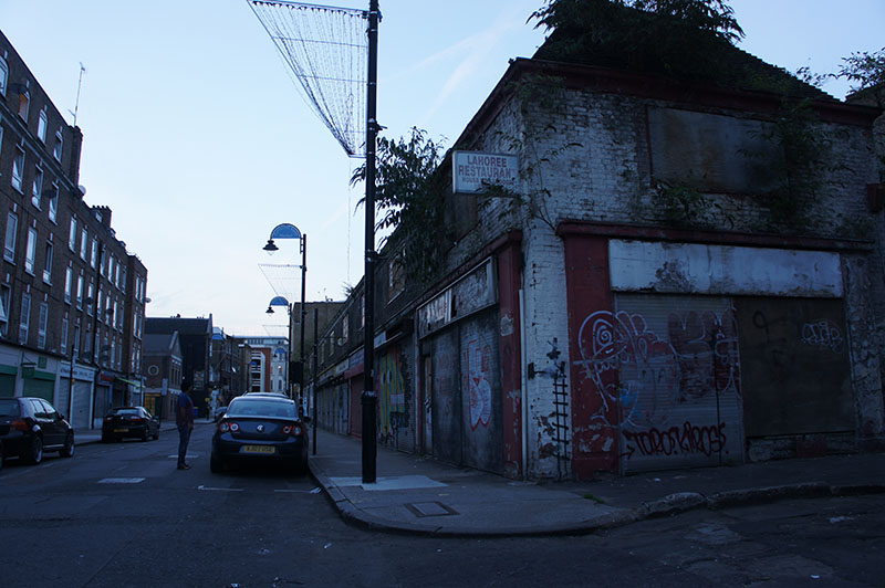Lolesworth Close leading off Commercial Street. This short bit of road is all that remains today of Flower & Dean street but it would originally have run from here through to Brick Lane.Post Tenebras Lux