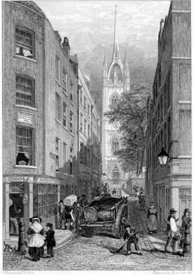 I'd stick with The City, Colin. Could this be St Dunstan in the East, before it was flattened in the Blitz and reconstructed? If so, that alley would have been somewhere near Great Tower Street, EC3.