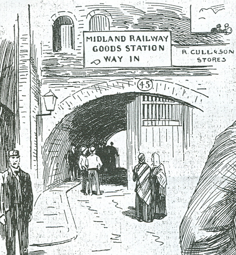 If you look next to the 'Midland railway Goods In' sign you will see another with 'R CU' followed by 'ST' under it. Thats the sign for R Cull & Son, Stores. Ive a better image somewhere, I will see if I can find it.