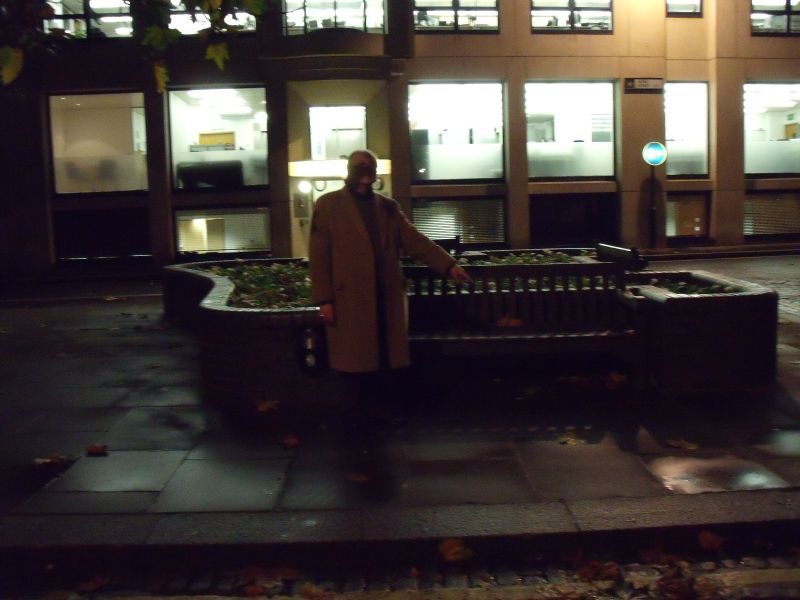 Here is an image taken last Monday 17th Nov. A friend points to the position where Kate Eddowes lay, there is no doubt a logical reason for the strange dark areas covering part of his face, and his coat but it is rather strange.