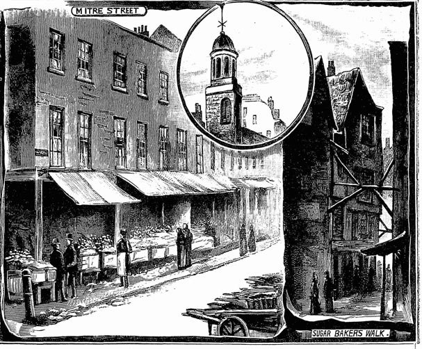 Mitre St north end, Creechurch spire & Sugar Bakers Yard, 1893: