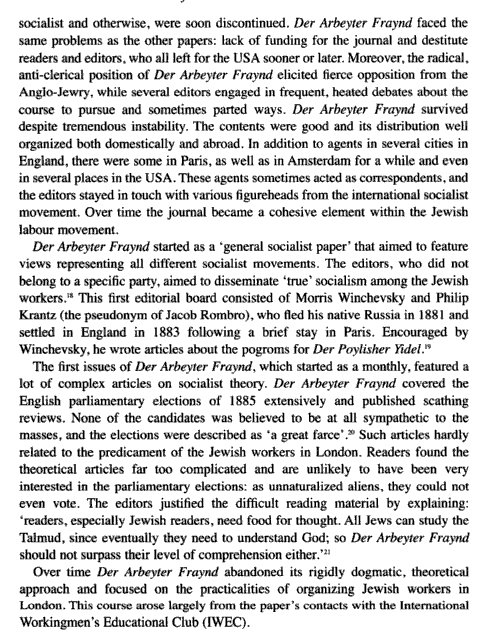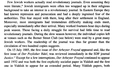 "It was almost eight years after this prologue to London Jewish socialism that Morris Winchevsky, who had been inspired by Lieberman's writing back in Russia, launched Britain's first socialist paper aimed at an immigrant readership. The Poylisher Yidl claimed to ‘treat the Jew... as a man, as a Jew, and as a worker'.[xiii] And in 1885, Winchevsky launched a new title, the Arbayter Fraynd (Worker's Friend) ‘to spread true socialism among Jewish workers'.[xiv] Earlier that year a group of Jewish socialists had reconstituted themselves as the International Workingmen's Educational Association, and set up a club in Berner Street off Commercial Road. In 1886 the club took over the running of the Arbayter Fraynd, and Berner Street became the centre of Jewish socialist activity. Clubs and journals were to form the two main axes of organisation for the East End Jewish radicals. The Berner Street Club's rule card grandly stated, ‘The object of this club is, by social and political enlightenment of its Members, the promotion of the intellectual, moral and material welfare of mankind'.[xv]"