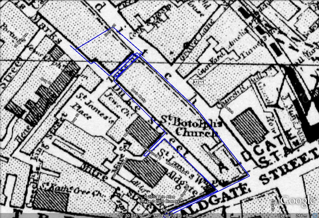 Between Harvey and Watkins I have several hours in teasing out the details. Harvey in particular is less than clear about the switchbacks he makes. Two of them are in Little Duke Street and a third in Church Passage. Forgive the less than tidy appearances. Start at the vertical line in Bevis Marks in and follow the inquest testimony of the P.C. to see what I mean. There is a lesson for us all on geography here, words are woeful characterisations of movements in physical space. Dave