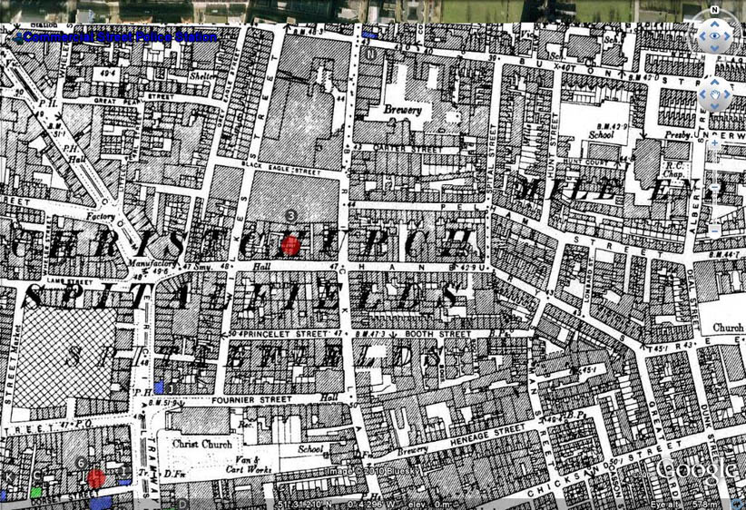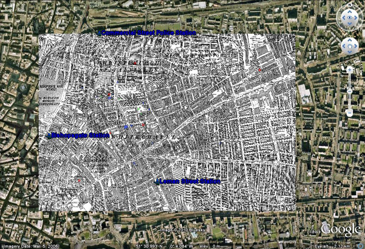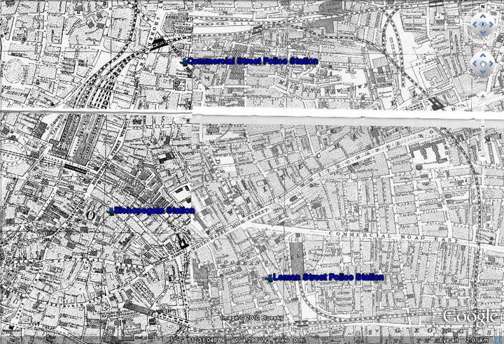 Since both sites are tied to notification of the Commercial Street Station, here is the geographic relationship. Crime scenes are red dots, CSS is top left of image. Dave