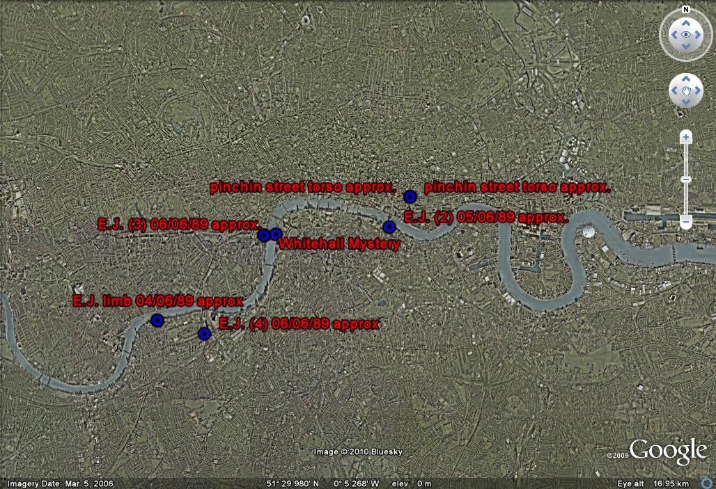 I plotted the positions of the murders linked by author Trevor Marriot, but the curvature of the earth will not allow a single capture to convey the distribution. Dave