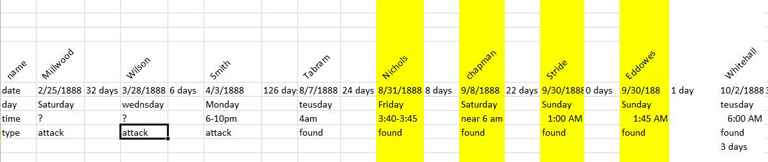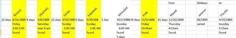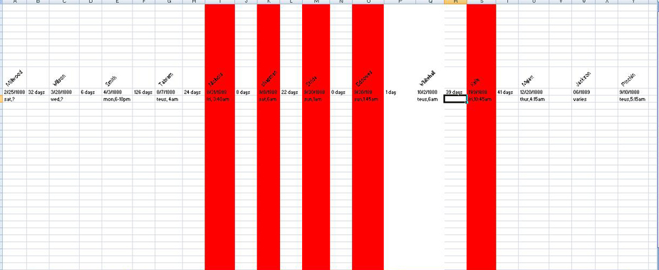 I have been informed that an arm belonging to the Whitehall Torso was found on Sept 16, 1888 and was determined to have been in the water at least 2 weeks. This places the window for the death of the Whitehall victim between the middle of August ( Dr. Hebbert) and early September. If you are re creating these spreadsheets, please make the alterations as the ones on this thread will be considered updated by this announcement. A very special thank you to DebraA for sharing this info. Dave