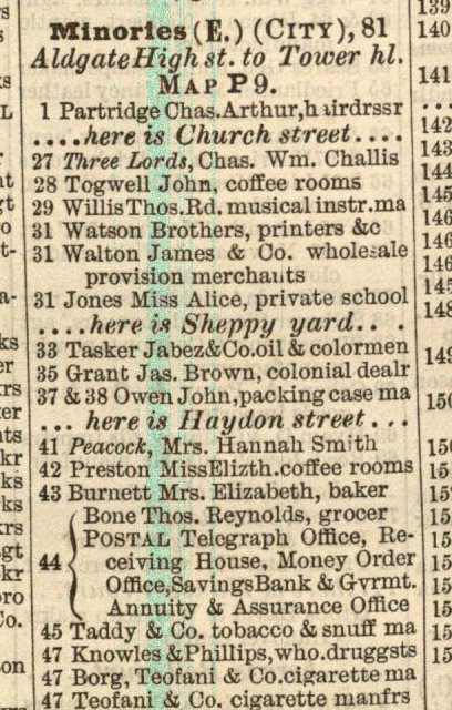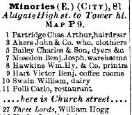 I understand your confusion, though. I'm confused too by the 1888 directory listing above. The fact that there is 1 Minories in the directory, then nothing till the Three Lords after Church St.