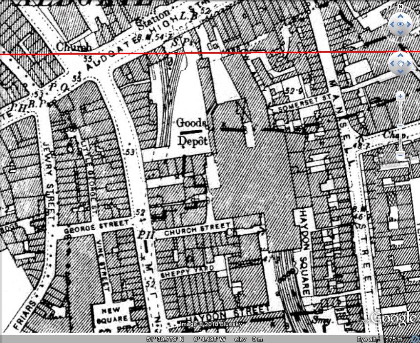 A Goad plan would show precisely which property it was, but it must have been somewhere close to the eastern side of the junction with Aldgate High Street.