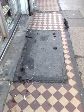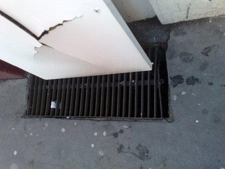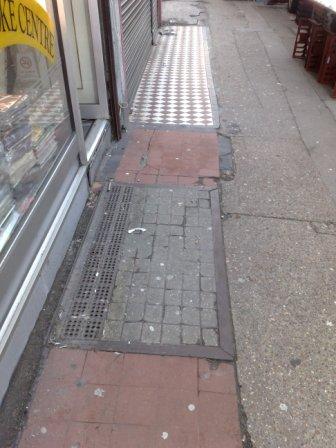 As far as the original shop fronts are concerned, along Wentworth Street, before the glass light well was added I suspect the recess opening was covered by a metal grill. This is an example found near-by on Commercial Street. The recess here is about eight feet deep, similar to that at Wentworth Model Dwellings. The recess would have extended either side of the grill, covered by paving.