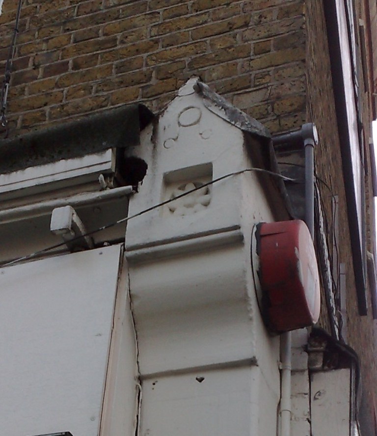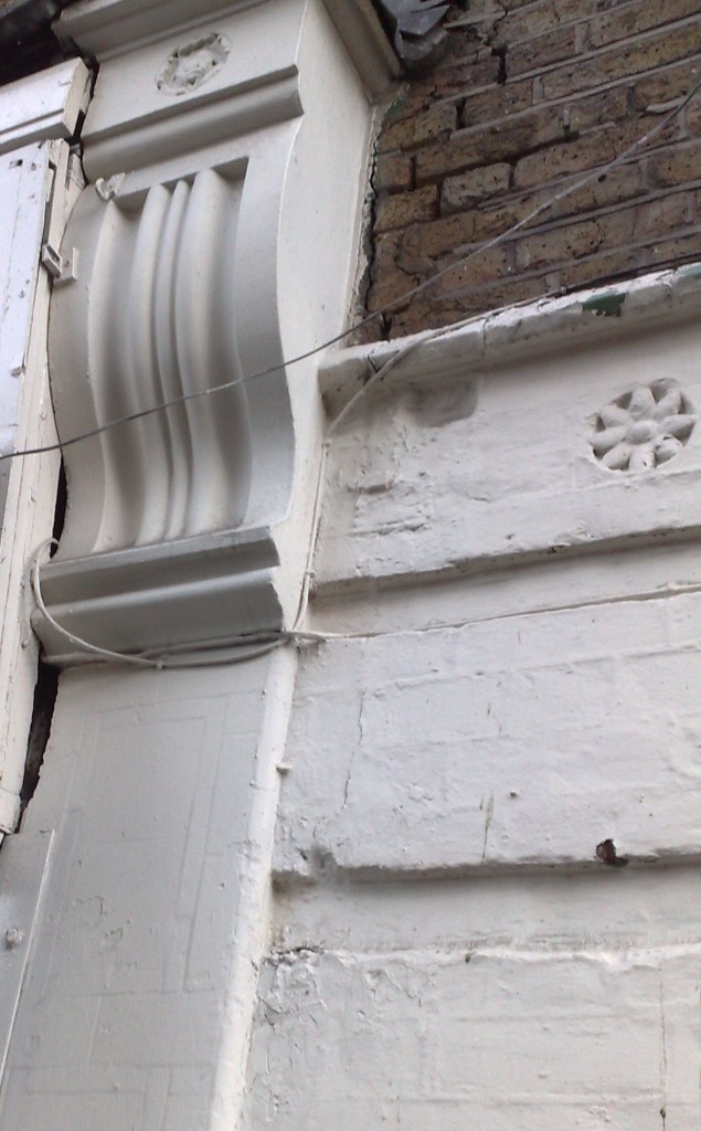 A great deal of care was taken in putting decorative architectural features into Wentworth Model Dwellings. Besides the corbels, there was distinctive patterned brickwork and a flower pattern motif that runs around the buildings. Here we can see how this motif has been cut into by the later corbel.