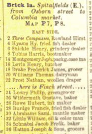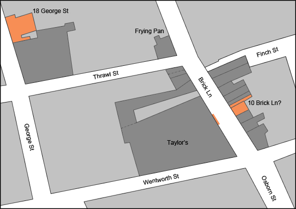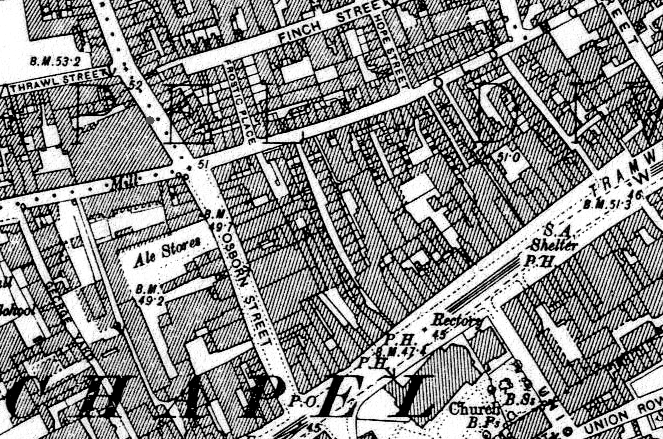 Most books say it was near the chocolate/mustard factory (which concurs) but many maps have it on the corner of Osborne/Brick Lane and Wentworth/Old Montague - usually the SW or NW corners.