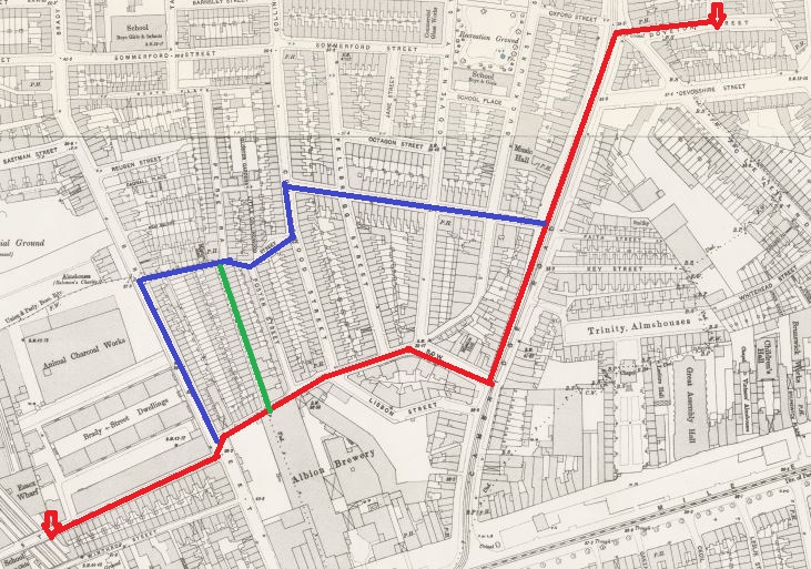 My strong suspicion is that he walked the same route that I did during the week going via Darling Row and the new Sainsburys walkway. This route did not exist in 1888 but Fisherman, I believe, simply cannot admit that his timing of 7:07 might be inaccurate.