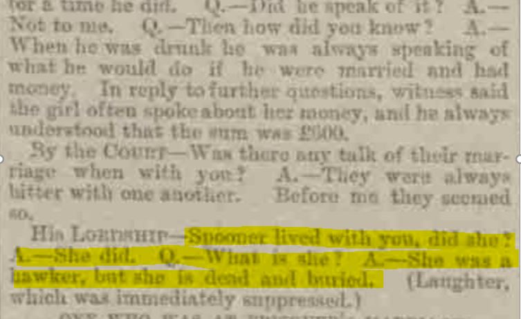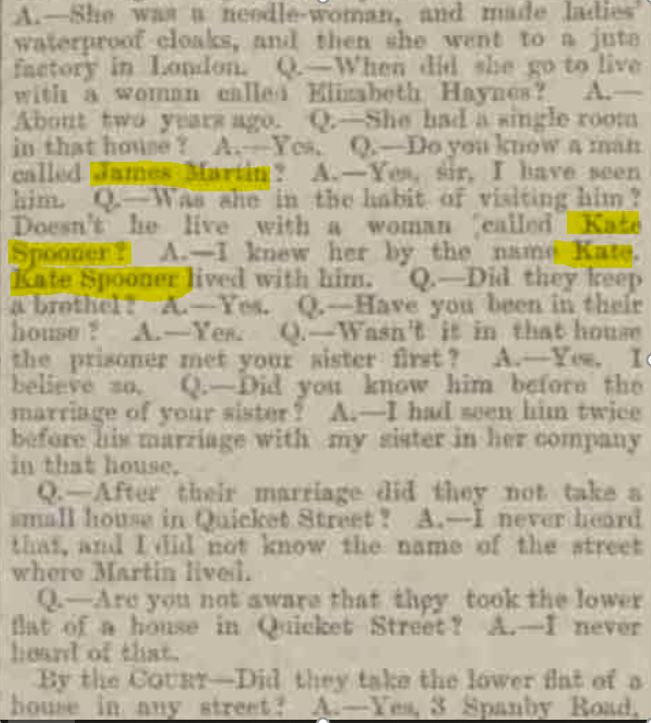 Can anyone find out if Kate Spooner who ran a brothel with James Martin on Quickett street was in anyway related to the witness Edward Spooner Born c.1863 a horse-keeper at Messrs Meredith's, living at 26 Fairclough Street, Whitechapel. Married to Catherine (b.1868)