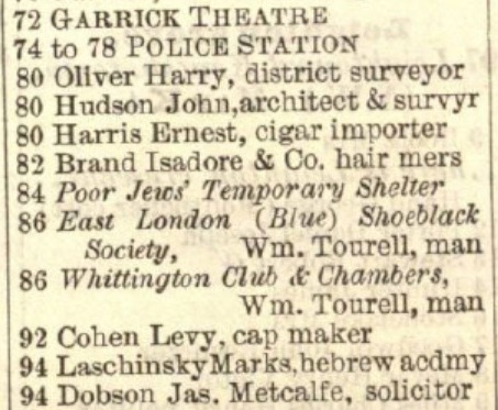 Fido, page 219 - "(The address on his death certificate is that of a protestant boys' club and refuge, evidently given in mistake for or by arrangement with the Shelter for Poor Homeless Jews next door.)"