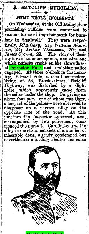 My understanding is that Inspector Race was transferred to 'H' Division in about 1893 or 4, and this may have given him access to files on the Whitechapel Murders which fuelled his suspicion that Thomas Cutbush was the Whitechapel Murderer, given his previous and local knowledge of Thomas on his own patch.