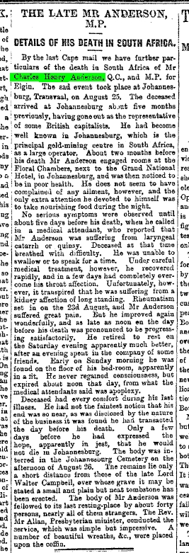 Anderson stood as M.P. for Elgin and Nairn, Scotland, in 1885 but was unsuccessful. At that time a short biography was published in the The Times:
