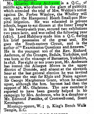 "Anderson, C.H., (Elgin and Naorn Shore) - Mr Charles Henry Anderson, Q.C., is a native of Yorkshire, and was born in 1838. He received a private education and the Council of Legal Education awarded him two exhibitions. He was called to the Bar in 1867 at the Inner Temple and as appoined a Q.C. last year. He was an unsuccessful candidate at the last general election."
