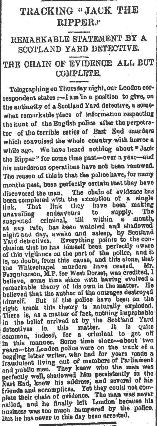 The date of the article is the same as the one which alluded to the confrontation between the un-named Lawende and Sadler which was a disappointment. That's a Jewish witness saying no to a suspect after the murder of a pretty, young prostitute. Sound familiar?