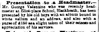 Mr. George Valentine who was recently headmaster at Eliot Place School, Blackheath, has been presented by his old boys with an album bound in white vellum and an address, and also with a purse of £150 as a slight token of their esteem and appreciation of his services.