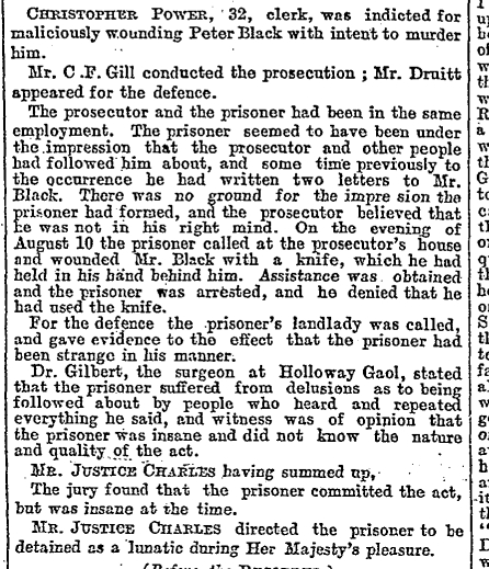 The prosecutor and the prisoner had been in the same employment. The prisoner seemed to have been under the impression that the prosecutor had followed him about, and some time previously to the occurrence he had written two letters to Mr. Black. There was no ground for the impression the prisoner had formed, and the prosecutor believed that he was not in his right mind. On the evening of August 10 the prisoner called at the prosecutor's house and wounded Mr. Black with a knife, which he had held in his hand behind him. Assistance was obtained and the prisoner was arrested, and he denied that he had used the knife.