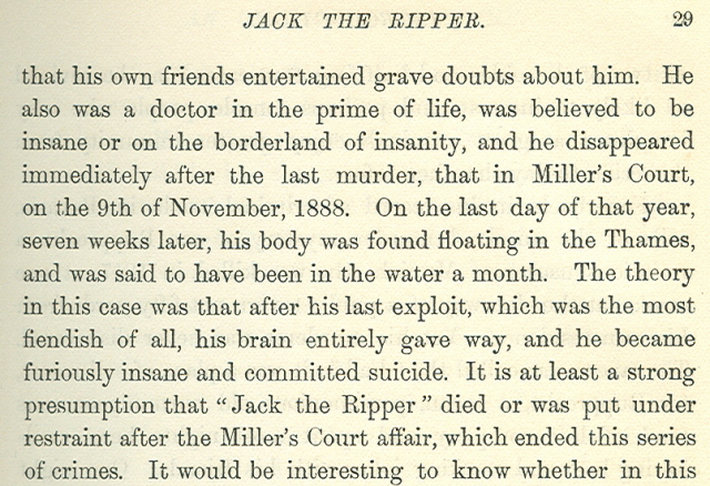 All sorts of things 'could be' if you wish to challenge the obvious. But let's look at McCormick's piece in its true context. McCormick is 'quoting' 'Backert', i.e. "...said Mr. Albert Backert." But where from? There is no known press report and absolutely no known reference to this story prior to McCormick's book. There was no known 'Thames suicide rumour' as early as March 1889 - and certainly a total absence of any such mention in the official police and Home Office records of the time. And if such information had been communicated to Bachert, after being 'sworn to secrecy' by the police around March 1889 you are not going to tell me that there would have been no other mention of it. Remember, when McCormick invented this tale no official records had been released.