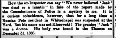 How the ex-Inspector can say "We never believed 'Jack' was dead or a lunatic" in face of the report made by the Commissioner of Police is a mystery to me. … The genuine "Jack" was a doctor. His body was found in the Thames on December 31, 1888."