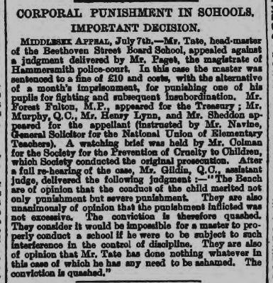 Here is something I notice awhile back. It might be worth pointing out that flogging, caning, corporal punishment, etc. in board schools became a national issue in 1888 when Mr. Paget, the Hammersmith Police Magistrate, fined a school-master for caning the living heck out of a young student. Somethings never change. This led to a flurry of letters to the editor, in newspapers across Britain, either supporting Paget's decision or denouncing it, with many being of the 'spare the rod, spoil the child' variety. There was even talk of the Home Office paying the school master's fine, in protest of Paget's decision. The case was eventually overturned in July, 1888, when it was decided that Tate (the school-master) did "absolutely nothing wrong." I suppose it would depend on Mr. Valentine's view of such matters, whether whipping the heck out a young student would be a "serious" matter or not. The courts and the Home Office seems to have been okay with it.