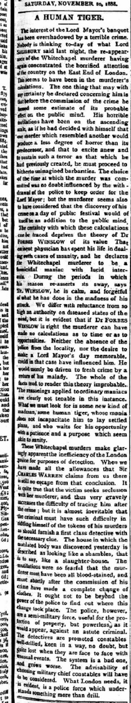 This article in the Shields Daily Gazette from Saturday 10 November 1888 is interesting, since it describes two opposite views on the killer the day after the murder of Mary Jane Kelly. One could say that on the one hand, the author of the article describes a disorganized killer, on the other hand, the author describes a well organized killer.