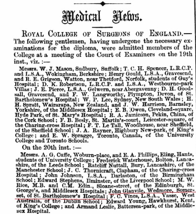 The Medical Times and Gazette of September 12, 1874 lists a Dr. John Glanvile as a House Surgeon at the Seamen's Hospital located in Greenwich S.E.