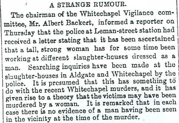 The inclosed (sic) is Mr Backert's letter to the Daily Chronicle. You can see what he says, and what he intends to do. He is to the front again in this case. May I suggest that he be a little more truthful than he was in the last 'Ripper' scare, I being the woman he so cruelly belied, and set the whole neighbourhood in alarm.