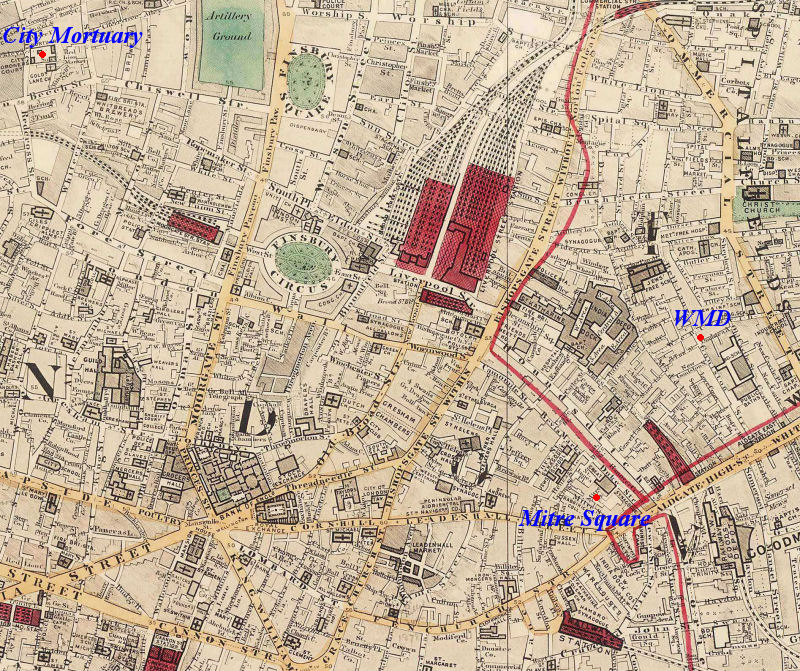 I'd say it was roughly half an hour walk from Goulston Street to the City Mortuary and probably a couple of minutes less from Mitre Square to the City Mortuary. I don't remember Long's beat of hand but it wouldn't have been any nearer to the City Mortuary than one block to the west.