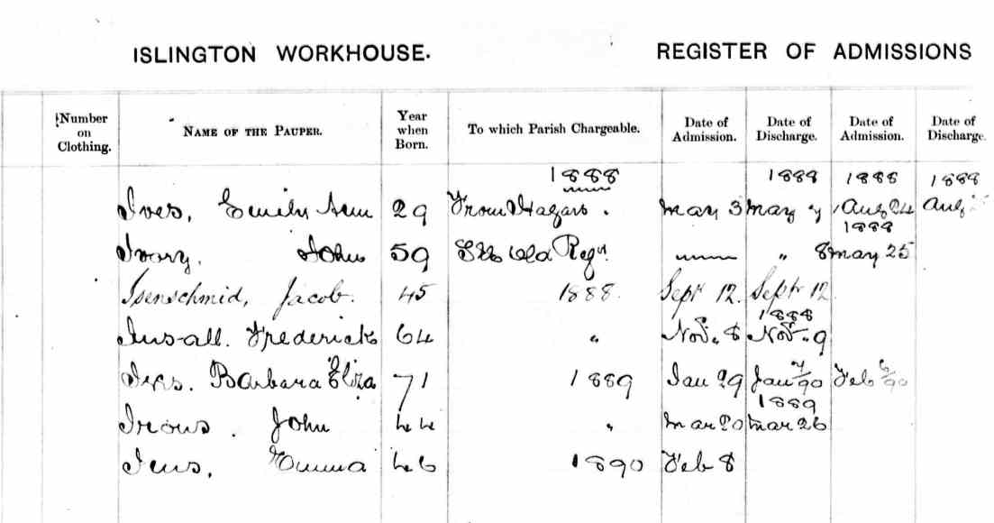 Here is the record showing Isenschmid's admittance and discharge - both on 12th September 1888 but untimed, from the Islington, the Liverpool Road, Workhouse.