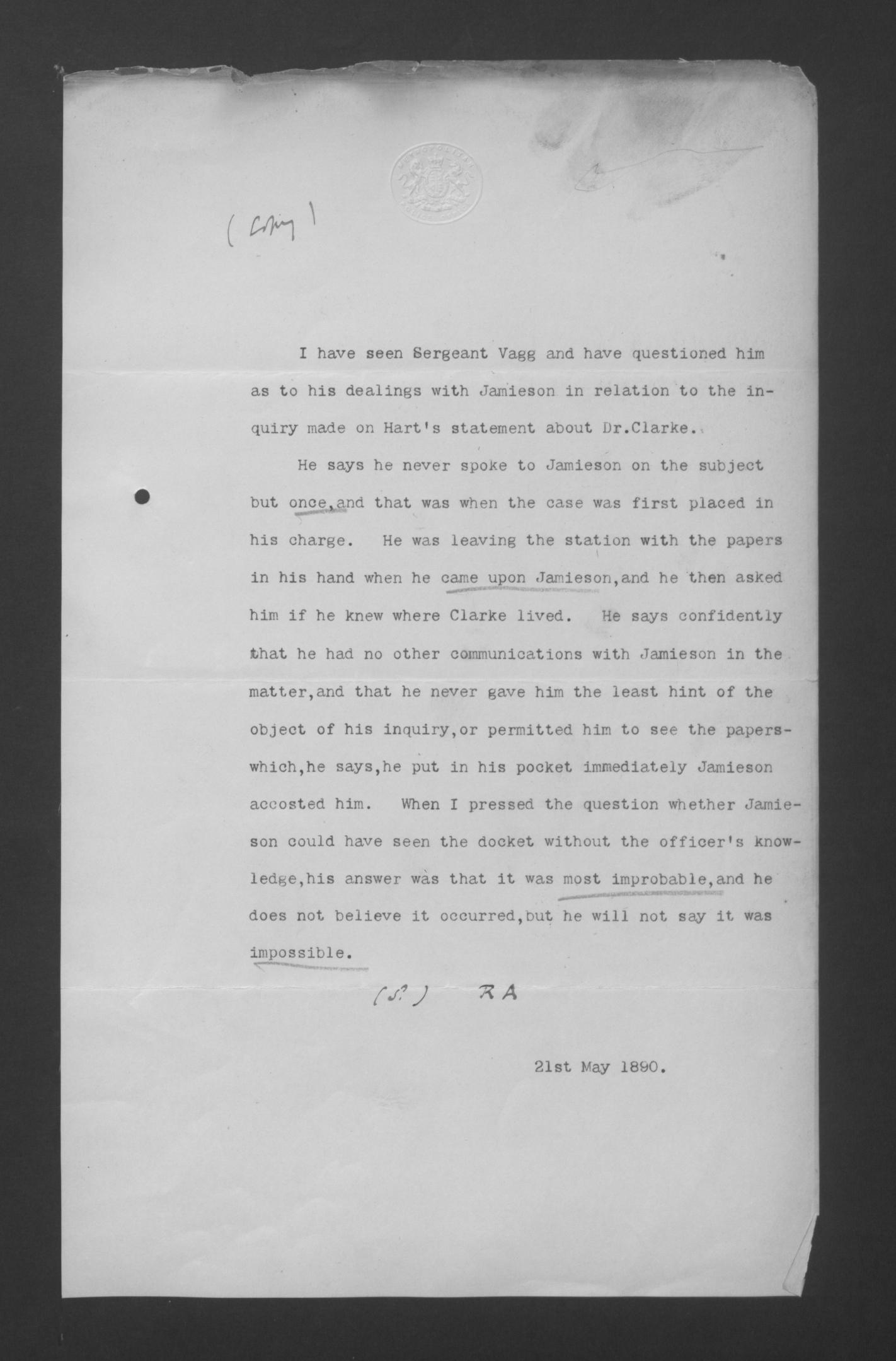 I managed to locate Clarke's correspondence to The Mercury (Hackney) that Hart mentioned. It's in the January 19th, 1889, edition, Page 7, Column 3. It's signed Charles M. Clarke LL.D., 27, Amhurst-road. His wife's name was Marion. The Clarkes provided The Mercury with letters from Robert Anderson.
