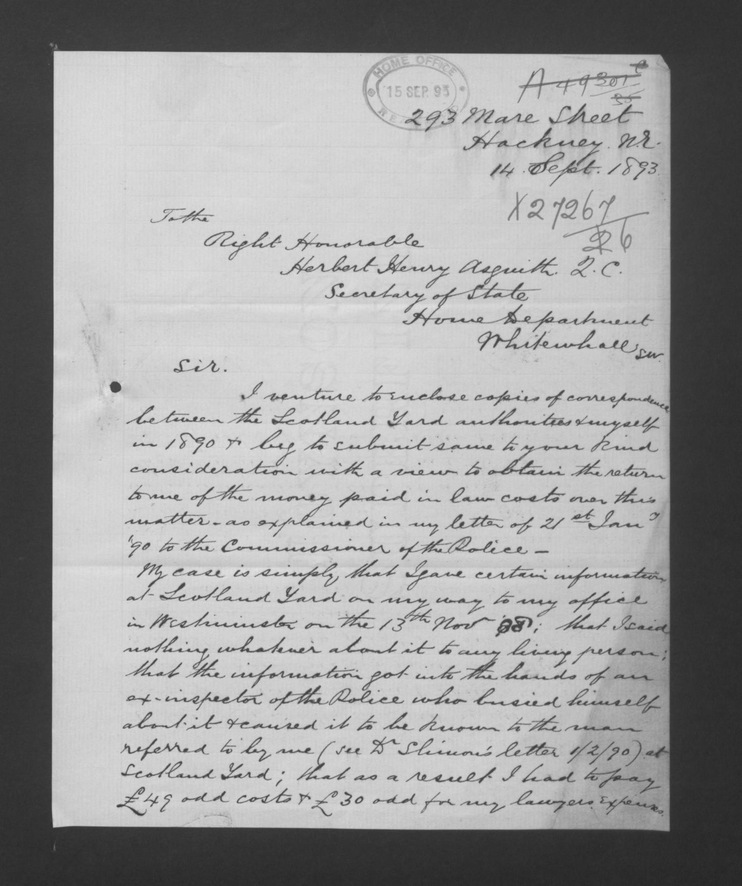 Hart to Asquith, September 14, 1893 - HO 45/9969/X27267