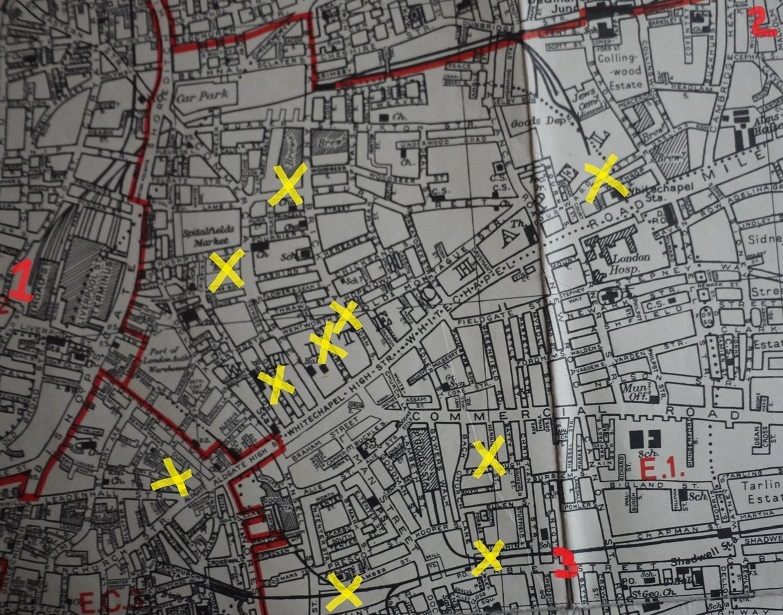 You might note that the Pinchin Street torso is the nearest yellow cross to any of the three marked locations. If he was responsible then the body would need to be within hauling distance of the secure location – in this instance being 147 Cable Street.