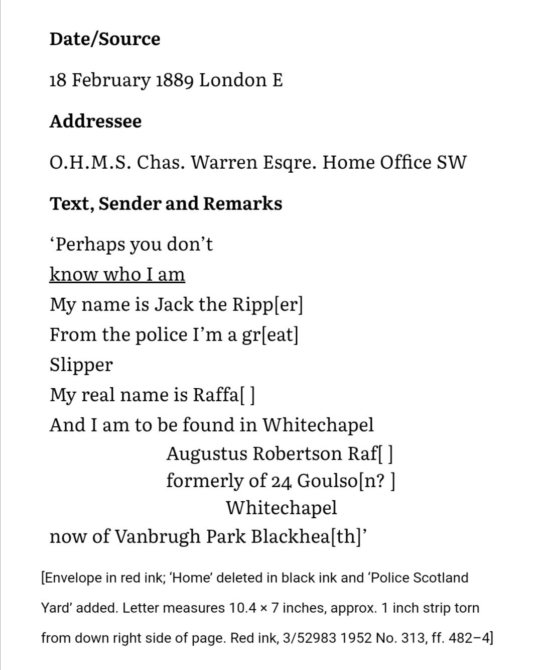 I will attach the letter and census record below. The screenshot of the letter is from the book Letters from Hell by Stewart Evans and Keith Skinner, a wonderful resource on correspondences claiming to be from Jack the Ripper, which contains an extensive transcription of the letters. It's a book I highly recommend if you're interested in that part of the case.