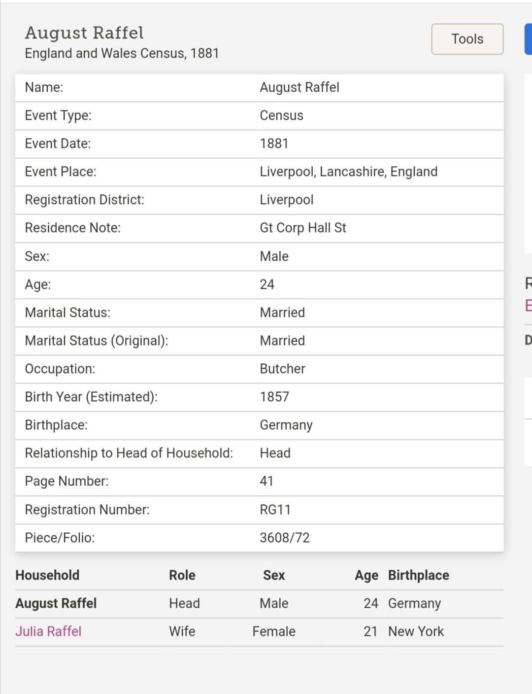 After various in depth searches of all surnames beginning with Raff such as Raffal, I couldn't find any matches with the first name Augustus or any variations. Then I discovered August Raffel. In the 1881 census he was 24 years old living in Liverpool but that part that caught my eye the most was that he was a butcher.