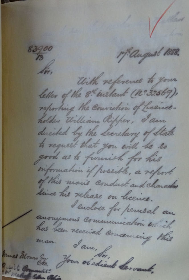 Originally posted by David Orsam View PostThe surname of my suspect was included in plain English in at least two of the communications signed "Jack the Ripper" in 1888. Furthermore, my suspect was known to the police, having a criminal record, and was mentioned in correspondence passing between the Home Office and the Assistant Commissioner of the Metropolitan Police during the summer of 1888. He also lived in London during the latter part of 1888, having recently been released from prison on licence.